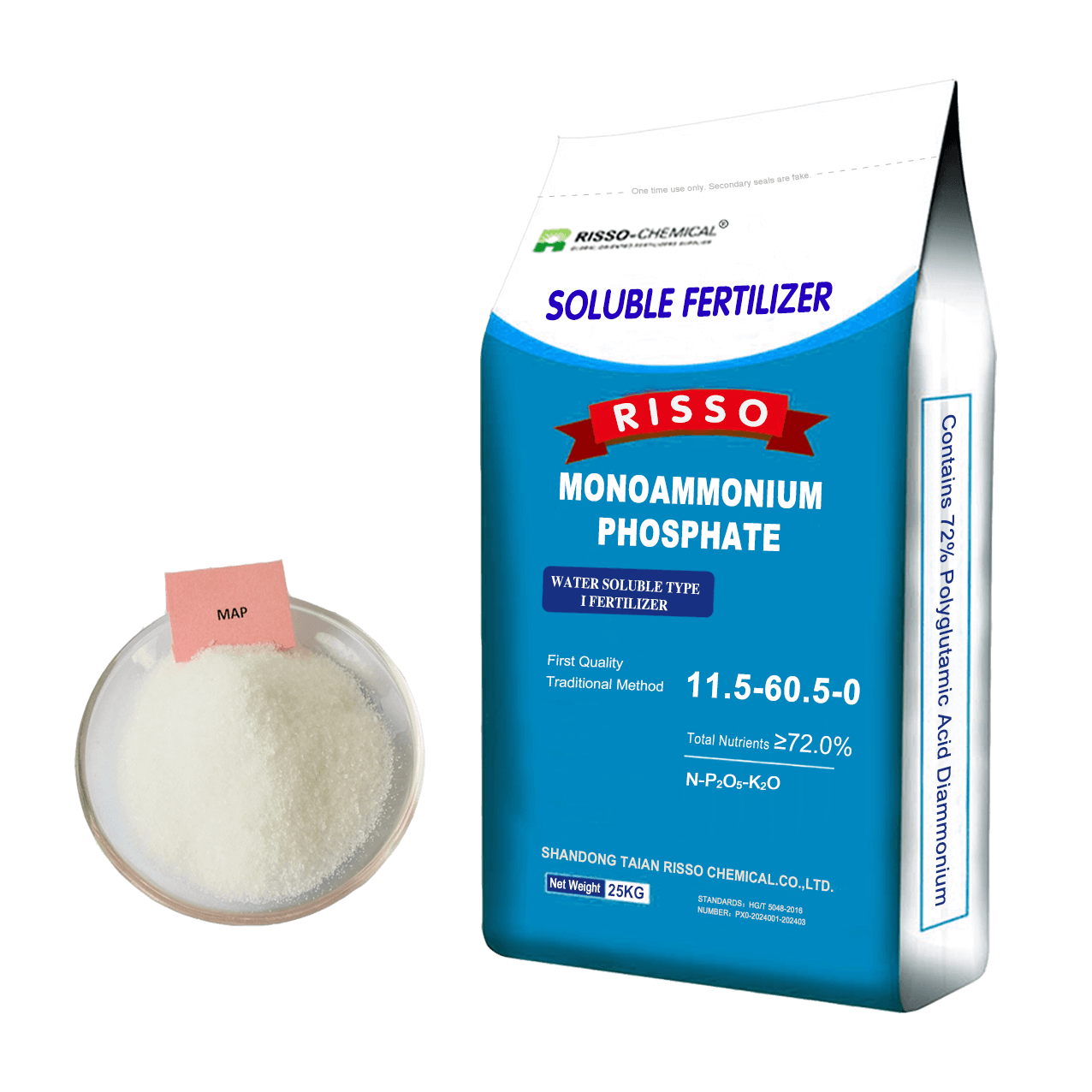 Risso production of monoammonium phosphate compound fertiliser, are produced using the slurry method, containing 11% nitrogen(N), 42-44% phosphorus pentoxide(P2O5), the total active ingredient of 53-61%. MAP is a nitrogen-phosphorus two-element composite fertiliser, It is often used in agricultural production as a basic compound fertilizer.